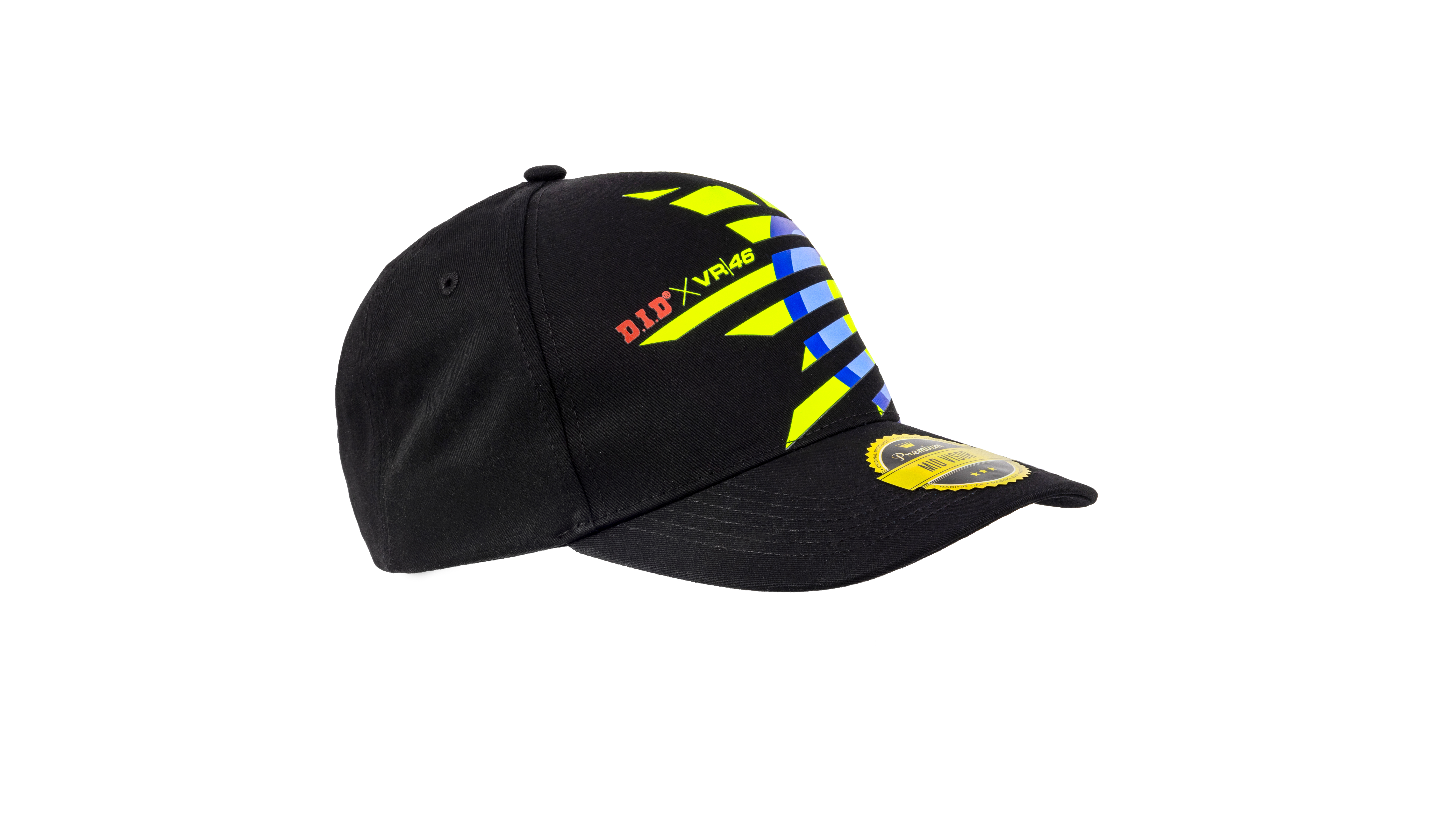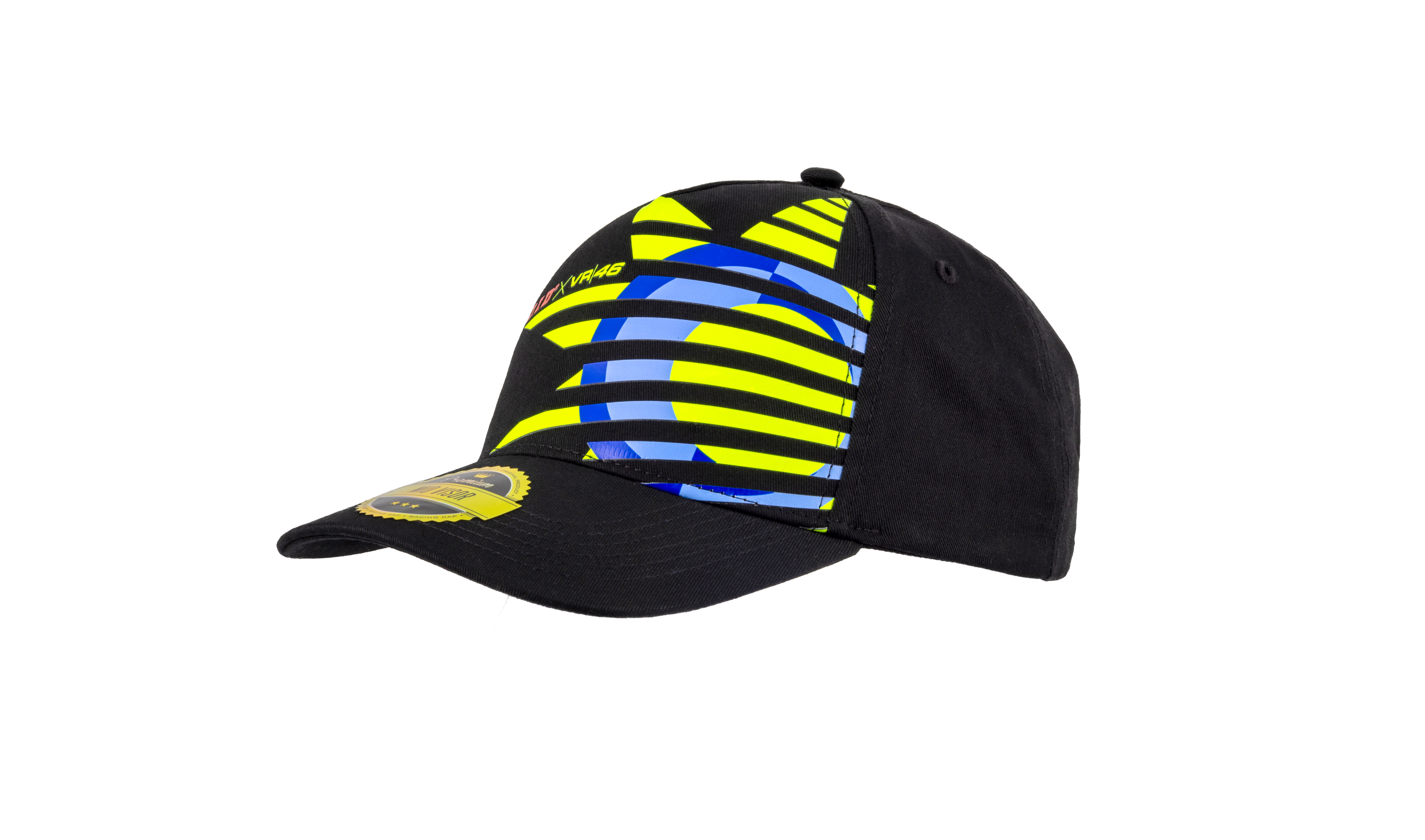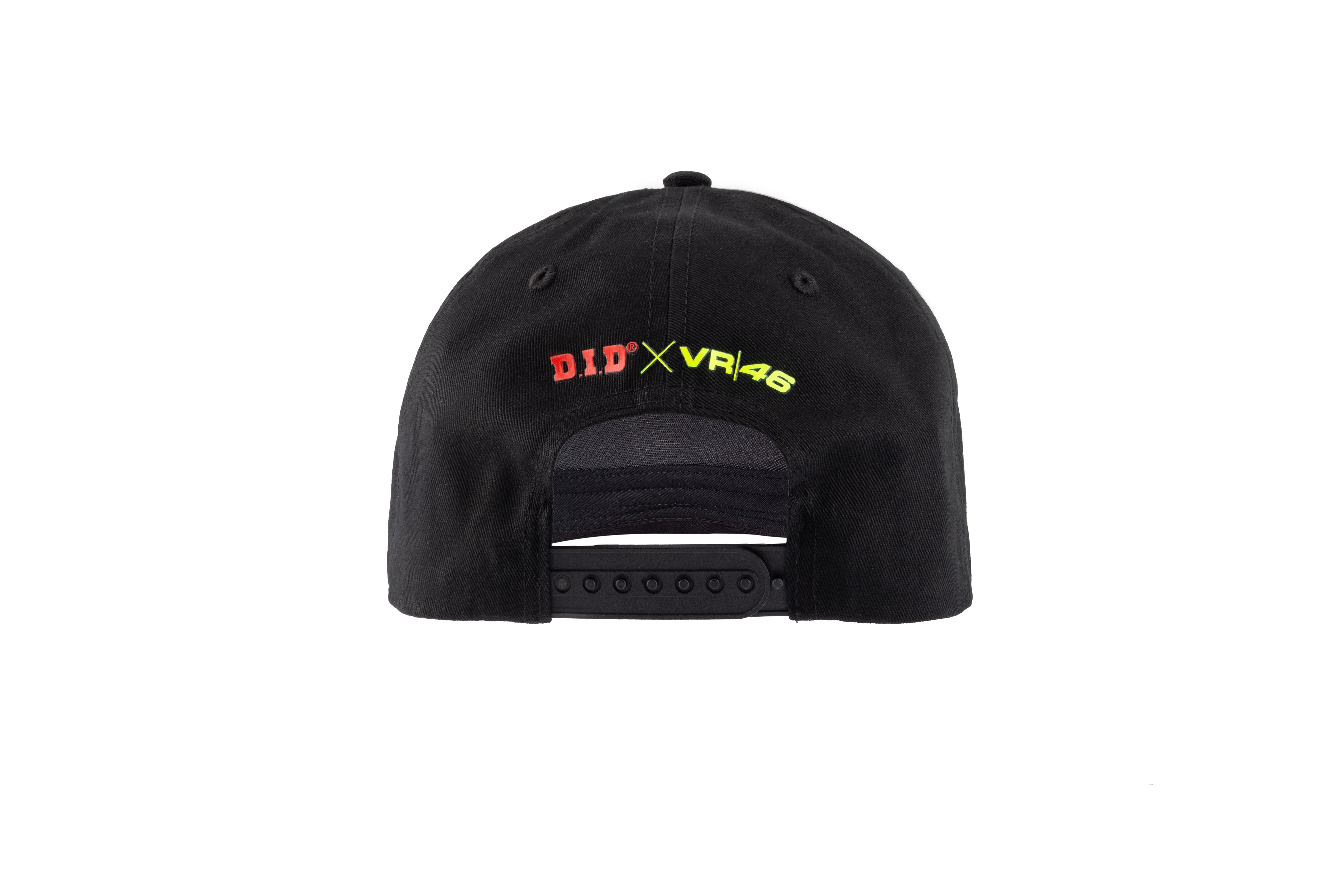 Cappellino di colore nero appartenente alla linea Sole Luna nata dalla collaborazione tra VR46 e D.I.D in cotone. Sulla parte frontale è stampata la grafica Sole Luna di Valentino in giallo, azzurro e blu e il marchio D.I.D X VR46. Sul retro è stampato il marchio D.I.D X VR46 a colori. Misura unica regolabile.