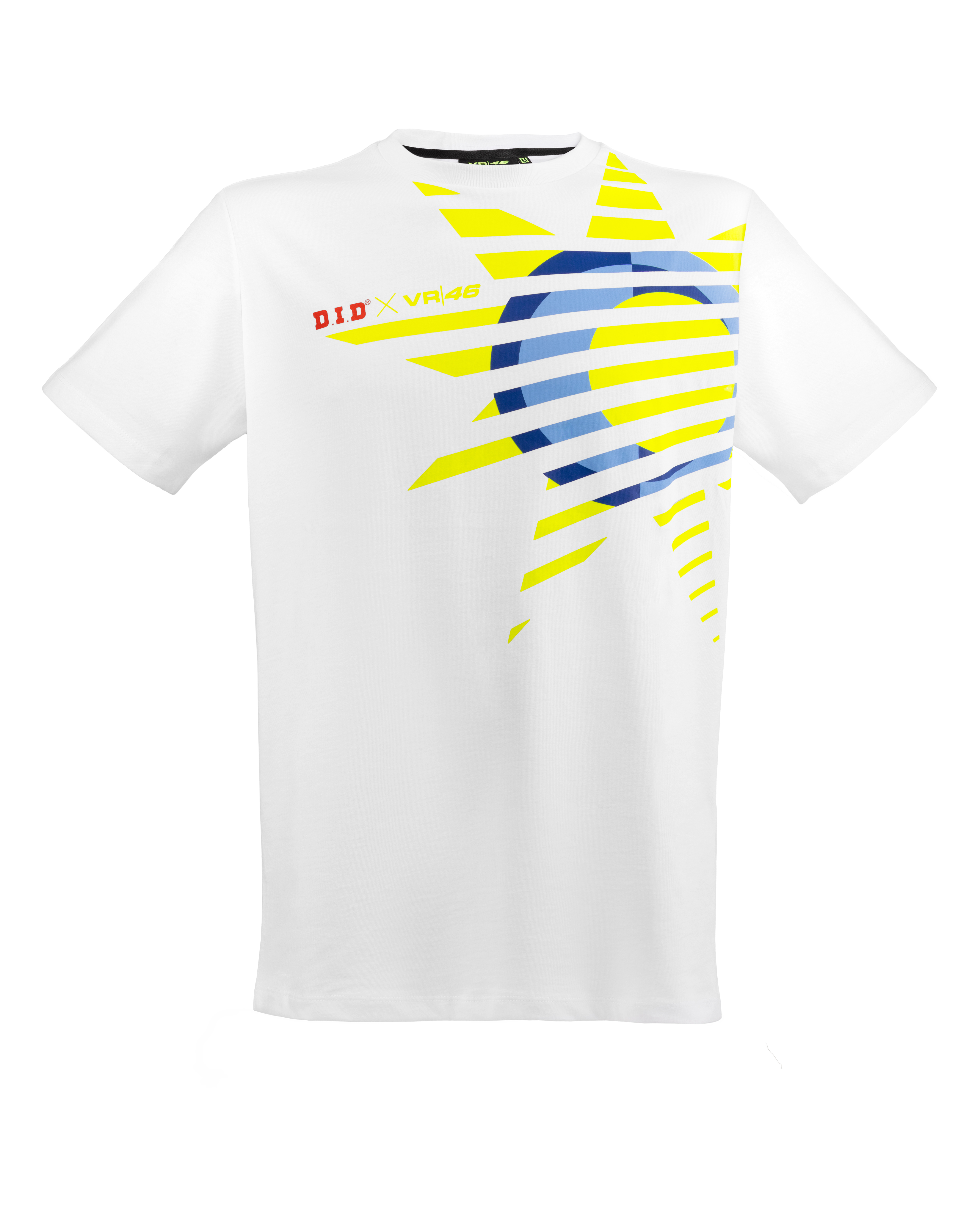 T-shirt bianca a maniche corte appartenente alla linea Sole Luna nata dalla collaborazione tra VR46 e D.I.D. La t-shirt è realizzata in cotone con vestibilità regolare. Sul petto è stampata la grafica Sole Luna di Valentino in giallo, azzurro e blu con il marchio D.I.D X VR46. Sul retro in alto è stampato il marchio D.I.D X VR46 a colori e in piccolo.
